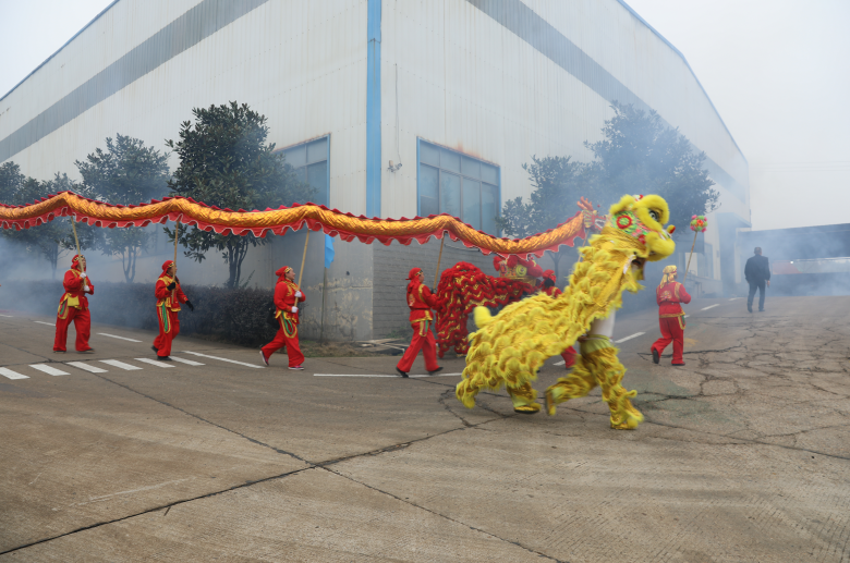 現(xiàn)場(chǎng),一條長約十余米、火紅色的龍?jiān)诳罩胁粩喾w,舞龍的師傅們個(gè)個(gè)精神抖擻,步伐矯健,伴隨著激昂的鼓點(diǎn),迎合著現(xiàn)場(chǎng)的鞭炮聲和歡呼聲,先是在公司門口,隨后隊(duì)伍從精密車間到鑄造車間,再到新辦公樓,獅龍環(huán)廠一周,每到一個(gè)車間,各車間早已準(zhǔn)備好鞭炮,歡迎著象征吉祥如意的獅龍!